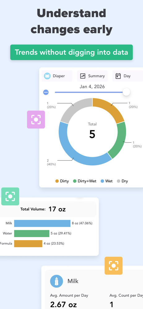 - Real-time tracker: Feedings, nursing, naps, diapers, milestones, pump, and more