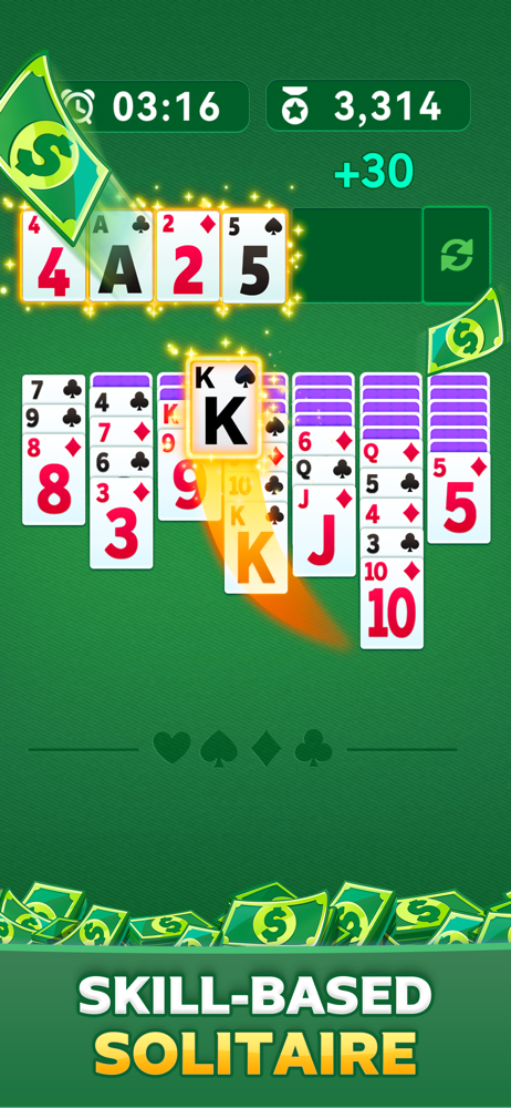 Sort a 52-card deck by tapping to move cards from the stock to the 7-column tableau with the ultimate goal of arranging all 4 suits into ascending order. Race against the clock to earn the highest score you can and outperform opponents to claim match prizes. Anyone can play this simple solitaire game, but it takes skill to walk away a champion!