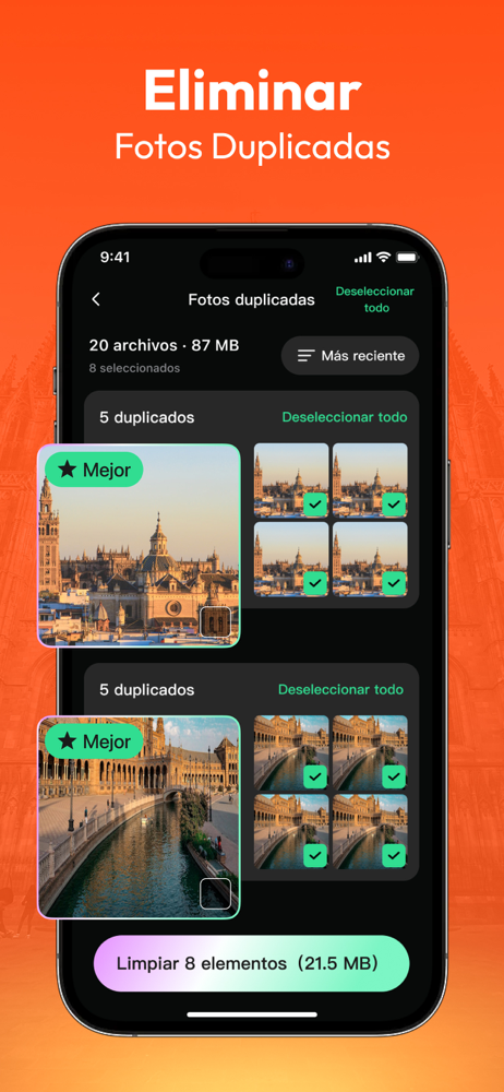 ◉ Limpieza de fotos similares: Detecta de forma inteligente fotos borrosas, ráfagas y capturas con ángulos similares. La app recomienda las mejores fotos para conservar, ayudándote a eliminar rápidamente el resto del desorden.
