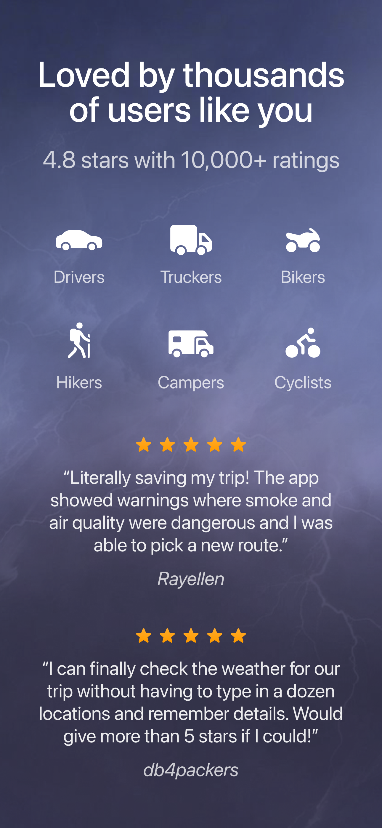 Weather and navigation combined to provide a route forecast precisely at the time you will be driving through. It’s the best weather app you can have on the road.