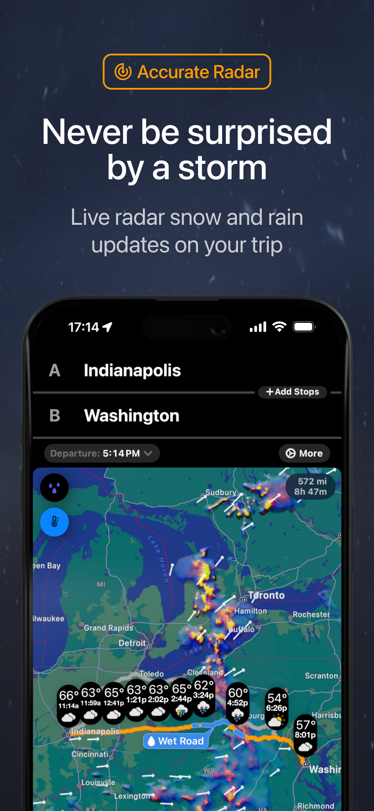 • Know What’s Ahead Before You Get There — See exact weather at every point along your route at the time you’ll actually be there