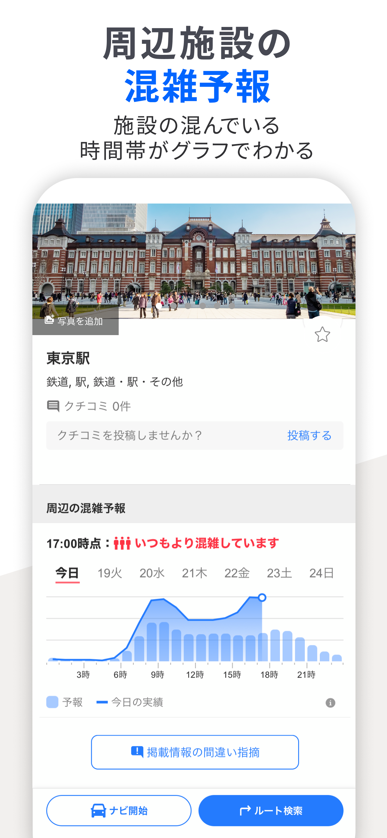 ・混雑予報:施設周辺や電車の混雑度がわかります。