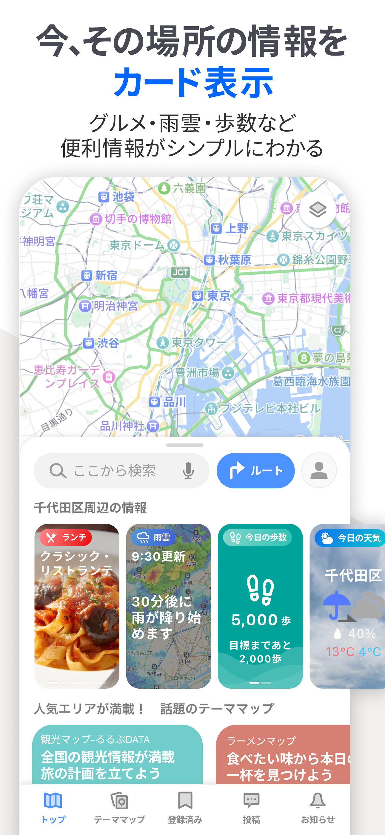 ・テーママップ:「ラーメンマップ」「EV充電スポットマップ」など用途に応じた専用地図。