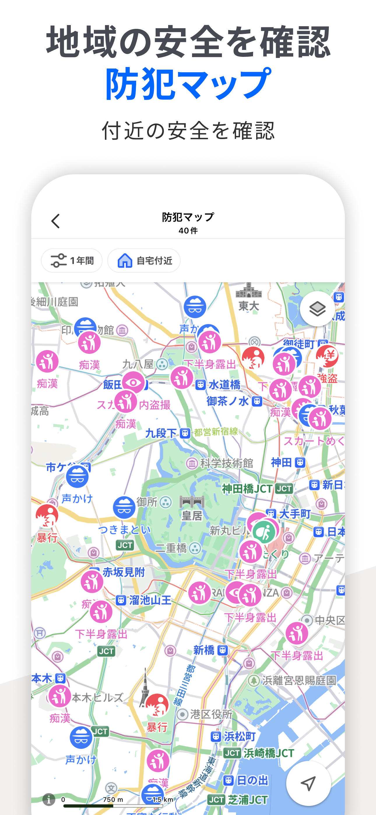 ・防犯に関わる情報を、9種類のアイコンで地図上に表示します。アイコンをタップすると詳細な内容が確認できます。(※2、※3)