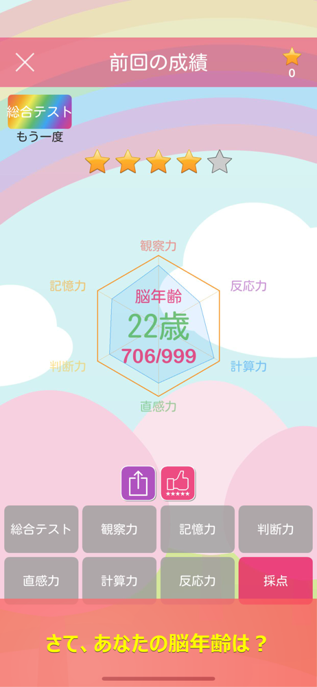 割と易しいものばかりです。 計算力だけがついていけてないですが…(笑) 頭を使い過ぎたくないけど、ちょっと考えてゲームしたい時にオススメ。 脳年齢の結果の信憑性は分かりません。これだと実年齢どおりの結果に。 他の脳年齢チェックでは歳いってる結果に。 やはりゲームの得手不得手で変化するものなので、軽いゲームと思って楽しんだら良いかと。。。 ただ、結果が若くなっていくのは慣れもあるでしょうが、実際若返っていってるのかもしれませんね(^^) 総合テストで脳年齢チェックするのに、気のせいか、計算力の時掛け算の割合が多い気が… 苦手なんですよ~ 二桁の掛け算。 でも出る問題は数字の小さい二桁の掛け算なので、インド式の掛け算で考えれば暗算でいけるレベルなので、得意な人はパッと解いちゃうんですよね! これも慣れると早くできそう。